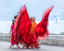 La Fête des Vignerons est un tour de magie. Celle-ci en particulier, qui se déroule autant dans la ville que dans l'arène. J'y trouve une touche particulière: la présence et le culot des femmes. Le fait que des personnages centraux du récit - la petite Julie dont la curiosité sert de fil rouge au spectacle, la Messagère boiteuse, la fée-libellule, les Cent pour Cent... - soient des femmes, le fait que l'on ait couronné une vigneronne pour la première fois n'est pas anodin. Les nombreuses Effeuilleuses ne se sont pas prier pour retrousser leurs jupons avec un sourire coquin. On s'encanaille. La photo de trois d'entre elles prenant cette pose a même été censurée dans le compte-rendu d'un très sérieux organe officiel du parti communiste vietnamien lu par des millions de personnes. Cachez ces genoux gainés de bas résille que je ne saurais voir! Il semblerait en revanche, de bonne source, que l'image se trouve toujours dans les bureaux des responsables dudit organe...